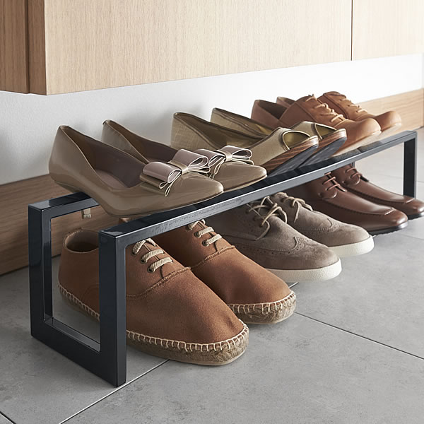伸縮するので、下駄箱下のサイズに合わせたり、靴の数に合わせて幅を変えて使う事ができるので大変便利!男性の革靴なら約6足、ヒールなら約8足収納が可能です。