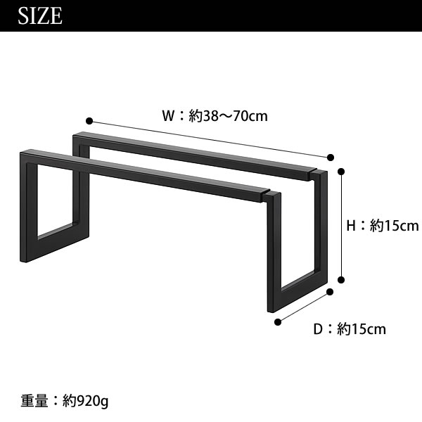 サイズ約 W38〜70 × D 15 × H 15 cm素 材【本体】スチール(粉体塗装)商品重量約920g耐荷重約5kg収納可能数男性のシューズなら約6足ヒールなら約8足備 考※ご使用のブラウザやモニターの環境により、商品の色の見え方に違いが出てまいります。