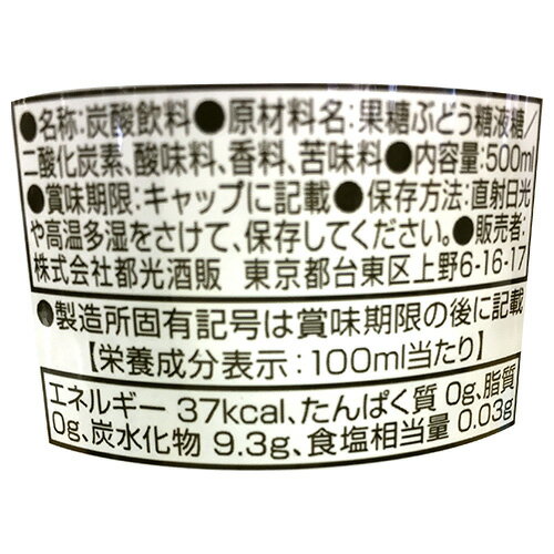 名称 炭酸飲料 原材料名 果糖ぶどう糖液糖/二酸化炭素、酸味料、香料、苦味料 販売者 株式会社都光 栄養成分表示100mlあたり エネルギー37kcal たんぱく質0g 脂質0g 炭水化物9.3g 食塩相当量0.03g 内容量(g) 500ml×24本 ※ワイン・洋酒など、ボトル商品(750ml未満)と同梱可能。